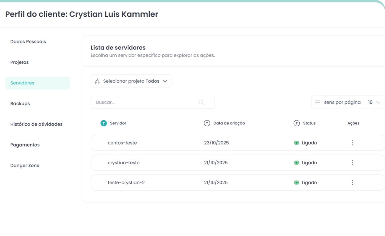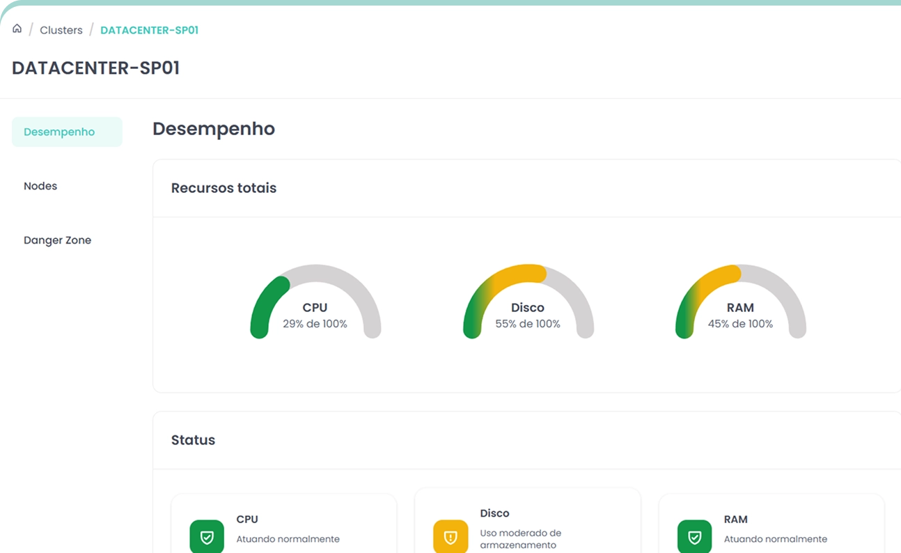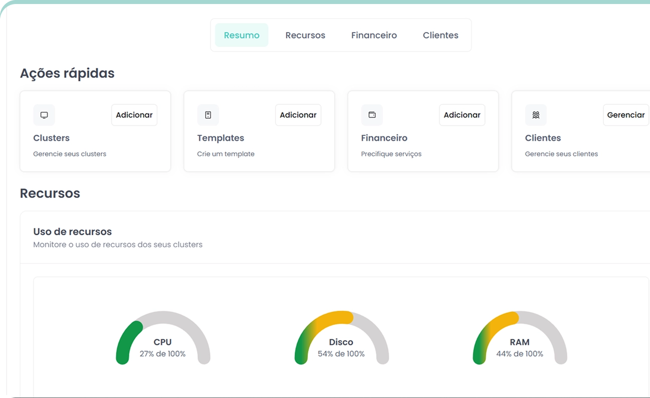 Gerencie a operação diária visualizando métricas em tempo real. Acompanhe consumo de recursos e VMs, ajuste permissões e consulte o histórico de atividades.