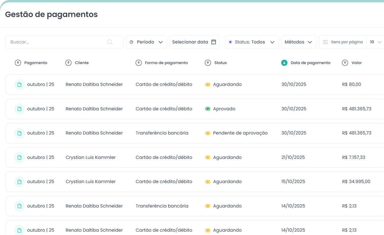 Controle completo de clientes, utilização, planos, cobranças e faturas. Acompanhe receita e uso em tempo real.