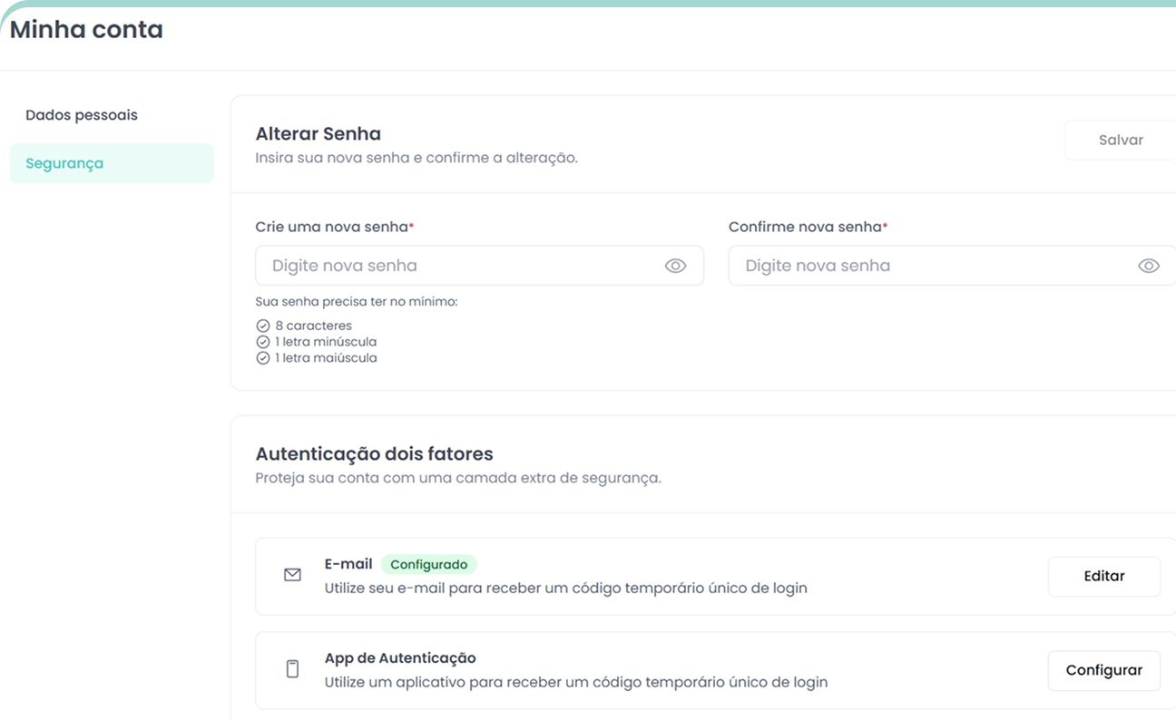 Mantenha a segurança da sua operação e dos seus clientes utilizando autenticação de dois fatores via e-mail ou app.