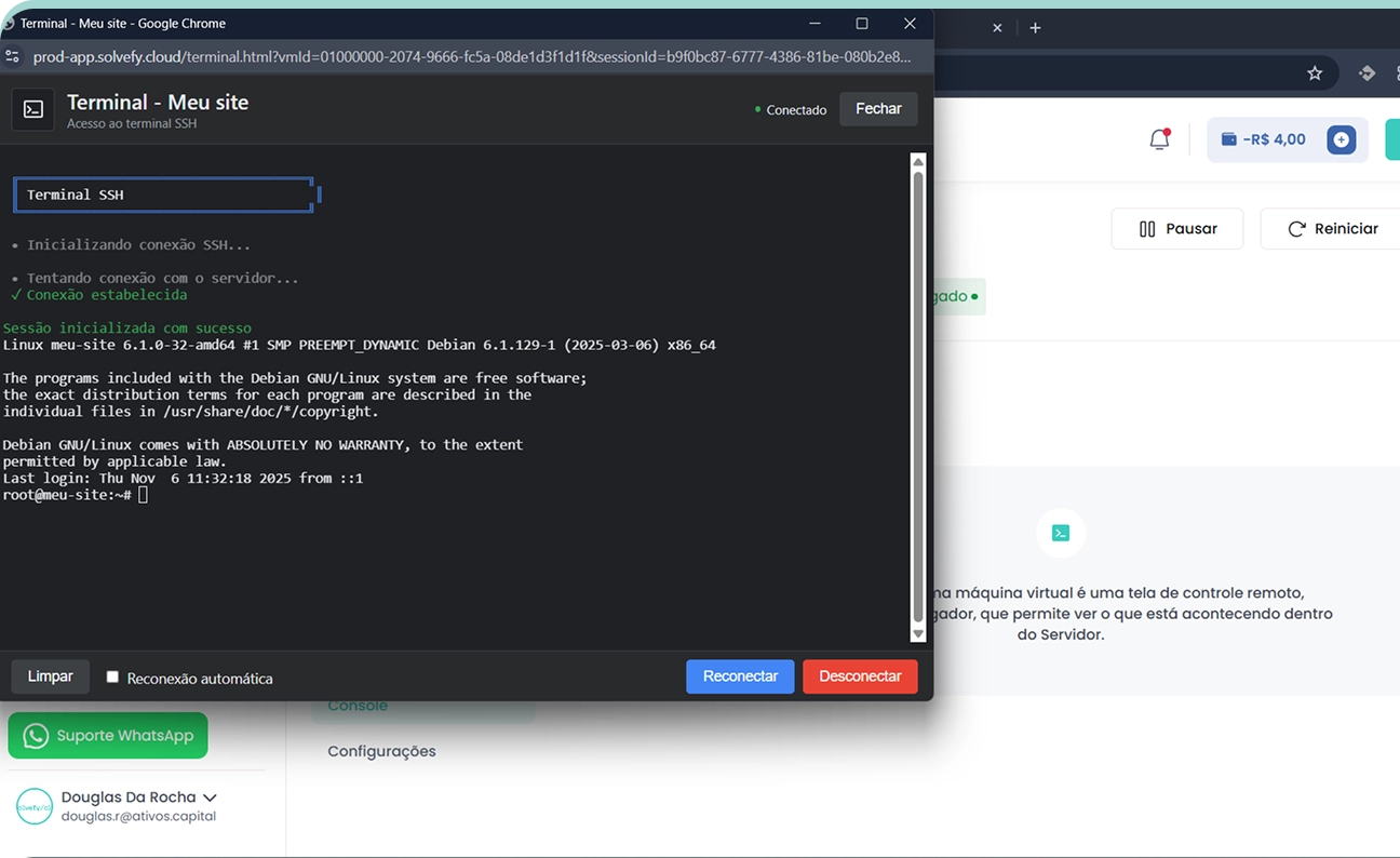 Possibilidade de acesso ao “monitor físico” da VM, realizado pelo cliente diretamente pelo console do dashboard. Resolução instantânea de possíveis ocorrências.