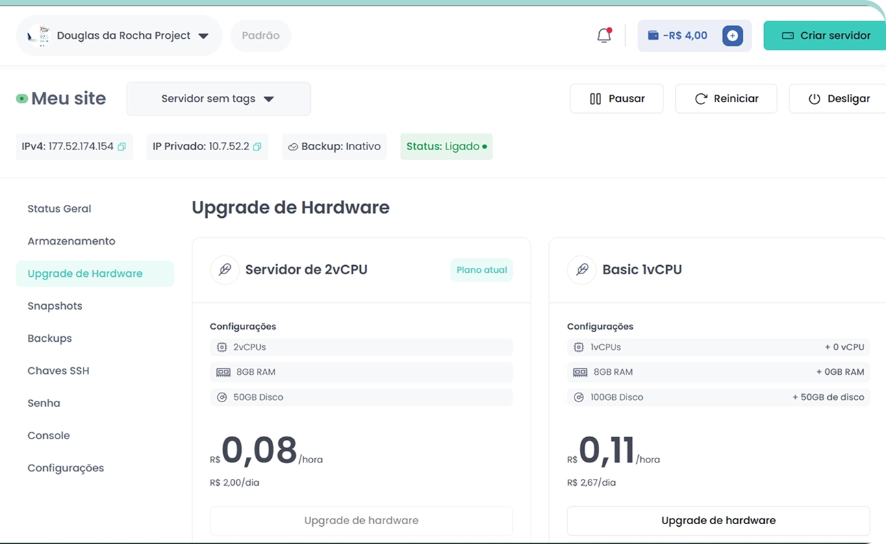 Permite que seus clientes ampliem recursos do servidor instantaneamente, sem burocracias. Escalabilidade rápida e facilitada.