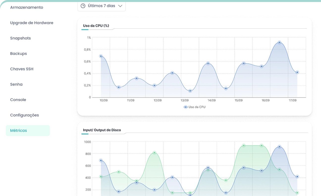 Gráficos de integridade que garantem monitoramento contínuo, facilitando a identificação de picos de atividade no servidor. Histórico completo, desde a criação.